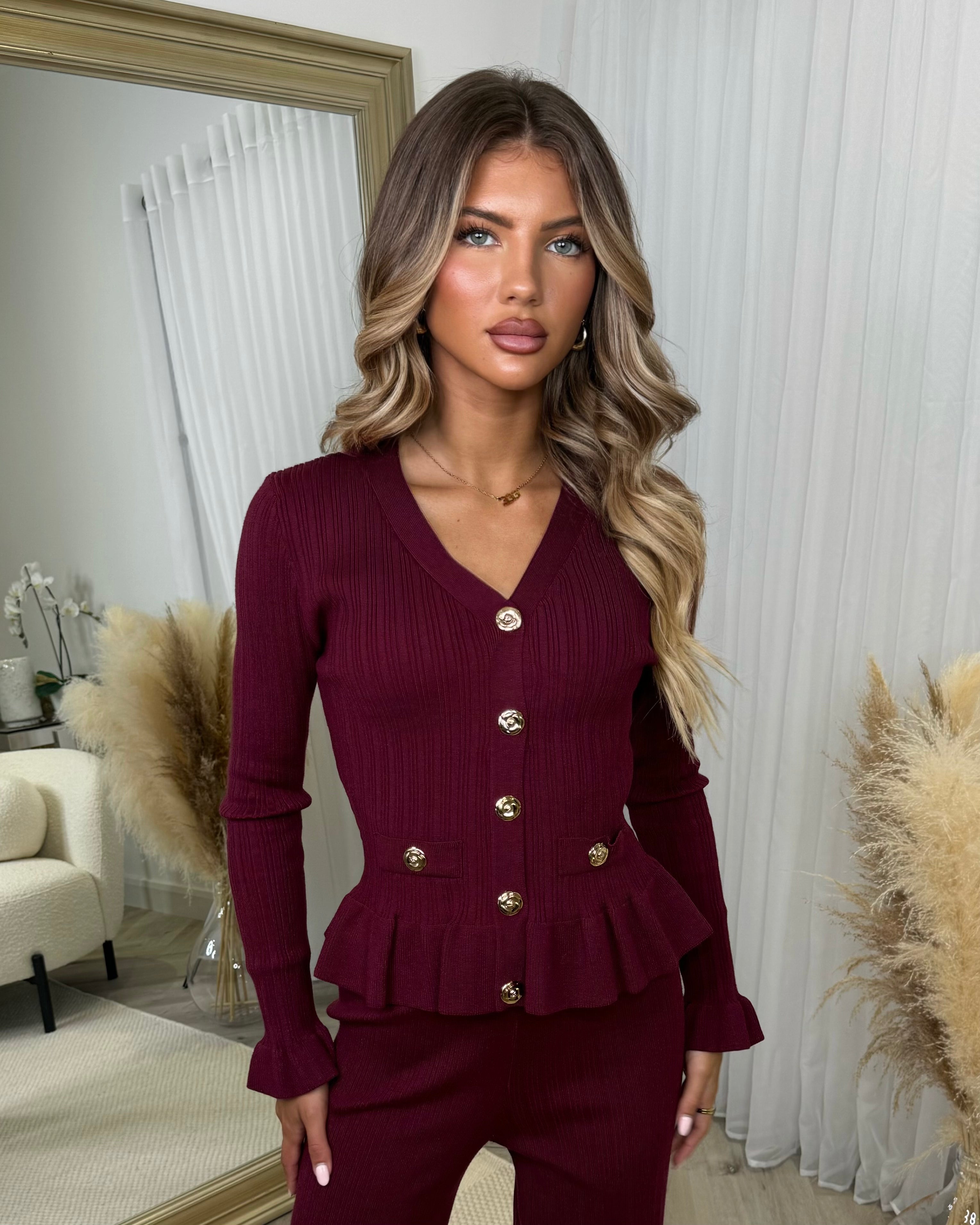 Ivana Ribbed Gold Button Long Sleeve Frill Detail Top & Trouser Set - Wine