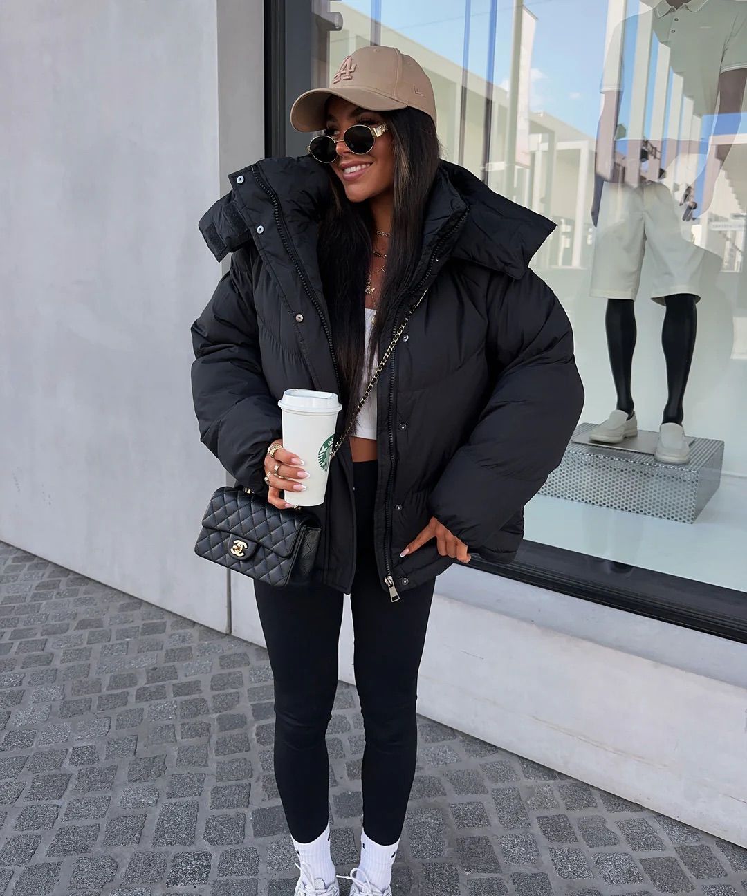 Phoebe Oversized Quilted Bomber Jacket with Hood - Black