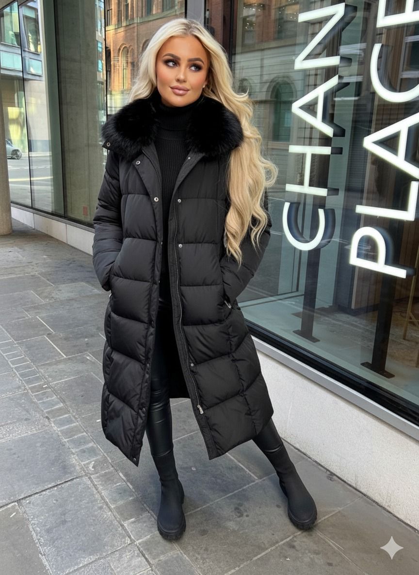 Poppy Long Quilted Faux Fur Hood Coat - Black
