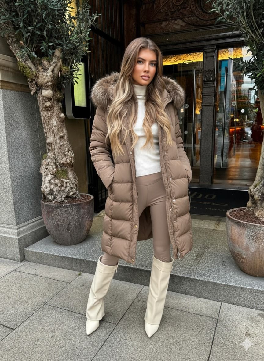 Poppy Long Quilted Faux Fur Hood Coat - Taupe