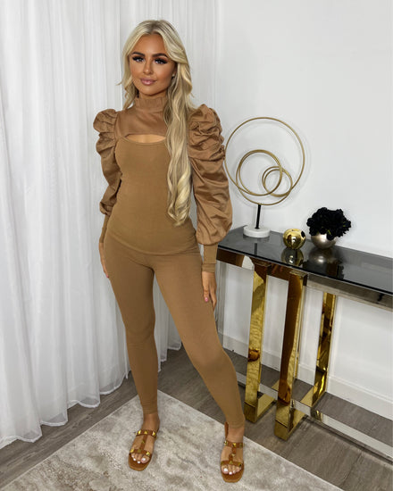 Kara Gold Button Frill Loungeset - Beige
